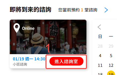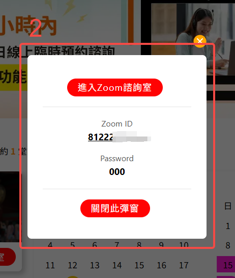 方法1:諮詢中退出諮詢室,可登入歌倫比亞官網上的會員中心,在「即將到來的諮詢」項目中,點擊「進入諮詢室」出現彈窗後,進入ZOOM諮詢室或將ID複製貼上至 ZOOM,即可重新進入諮詢。
